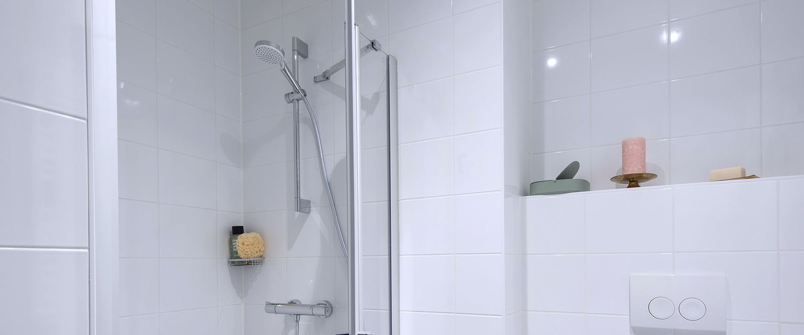 Anti-skid Ceramic tiles on floor and ceramic wall tiles up to 7 feet height. White coloured branded sanitary fittings, Chromium plated taps , concealed plumbing