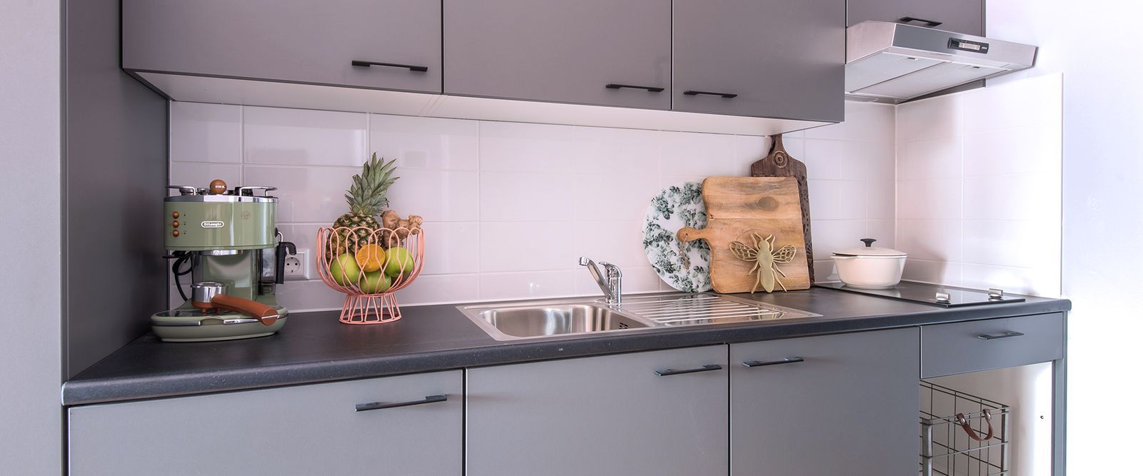 Ceramic tiled flooring, Granite counter top , Single bowl stainless steel kitchen sink with drain board and provisions for water purifier , electric hood , exhaust fan will be provided
