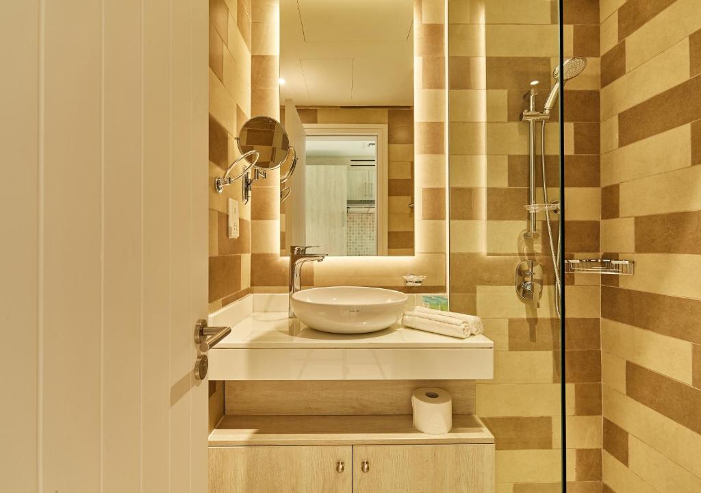 Anti-skid Ceramic tiles on floor and ceramic wall tiles up to 7 feet height. White coloured branded sanitary fittings, Chromium plated taps , concealed plumbing