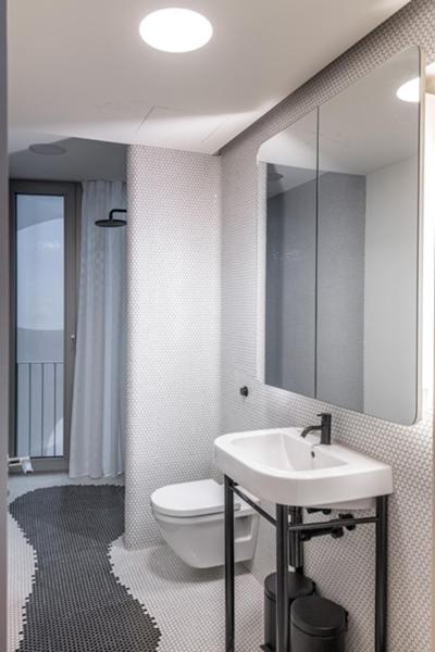 Anti-skid Ceramic tiles on floor and ceramic wall tiles up to 7 feet height. White coloured branded sanitary fittings, Chromium plated taps , concealed plumbing